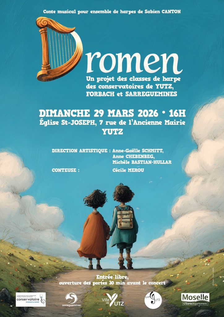 La classe de harpe de l’Ecole Municipale de Musique de Yutz, sous la direction de leur professeure Anne-Gaëlle SCHMITT, en collaboration avec la classe de harpe d’Anne CHEBENBEG du conservatoire de Forbach et avec celle de Michèle BASTIAN-HULLAR du conservatoire de Sarreguemines, propose un spectacle tout en poésie le dimanche 29 mars à 16h à l’église st Joseph de Yutz : DROMEN.